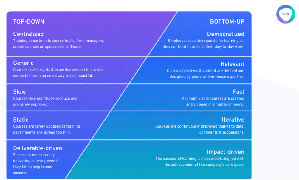 Because internal subject matter experts are the ones creating content, your L&D team is freed up to concentrate on other tasks. They still stay in the picture as facilitators, but they can spend more time on things like understanding learning needs, talent management, or other strategic questions.